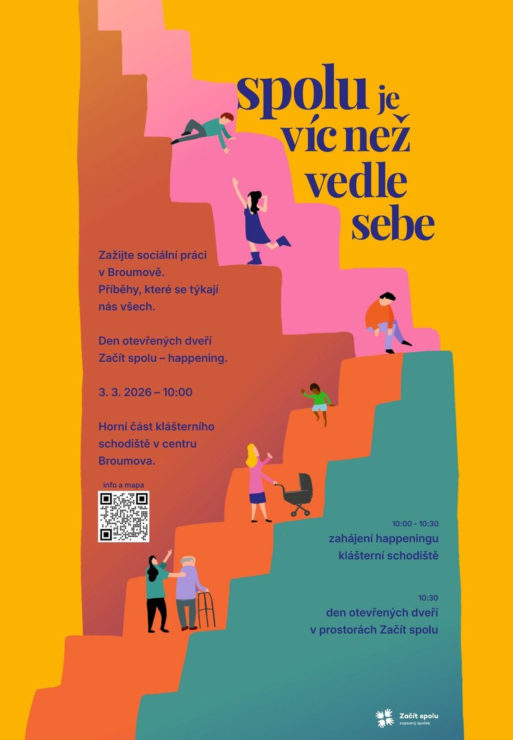 Zveme vás na netradiční Den otevřených dveří, který proběhne formou happeningu na schodišti spojujícím centrum Broumova se čtvrtí pod klášterem. Na cestě dolů se seznámíte s příběhy skutečných lidí, kteří se ocitli v těžké životní situaci – a s tím, jakou roli v jejich životě sehrála odborná sociální pomoc. Akce vám umožní nahlédnout do každodenní práce organizace Začít spolu, pochopit smysl sociální aktivizační služby a jejich dopad na celé město.