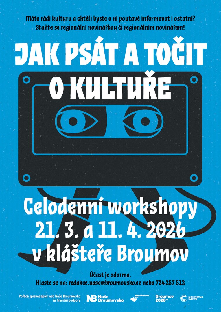 Máte rádi kulturu a chtěli byste o ní přinášet poutavým způsobem zprávy i ostatním? Zpravodajský web Naše Broumovsko zve na workshopy kulturní publicistiky pro veřejnost, které se konají v únoru a v březnu pod vedením kulturních novinářů a zkušených editorů. Účast na nich je zdarma.