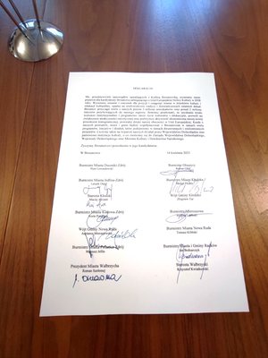 Společnou deklaraci, která vyjadřuje zájem o česko-polskou spolupráci nejen na poli kultury, podepsali představitelé měst a obcí Wałbrzych, Kłodzko, Nowa Ruda, Głuszyca, Radków, Polanica-Zdrój, Mieroszow, Jedlina-Zdrój a Kudowa Zdrój a okresu Kladsko. Za Královéhradecký kraj, který je partnerem kandidatury Broumova, na setkání promluvila náměstkyně hejtmana Martina Berdychová: „Pro Královéhradecký kraj je to významný den, protože jde o další důležitý krok na cestě kandidatury města Broumova k navázání spolupráce a zapojení polských partnerů. Věřím, že to pomůže oživit celé naše území. Královéhradecký kraj vnímá kandidaturu nejenom v rámci Broumova, ale pro celé naše území – nerozlišujeme, kde máme hranice, protože všichni jsme to celé velké krásné Broumovsko.“