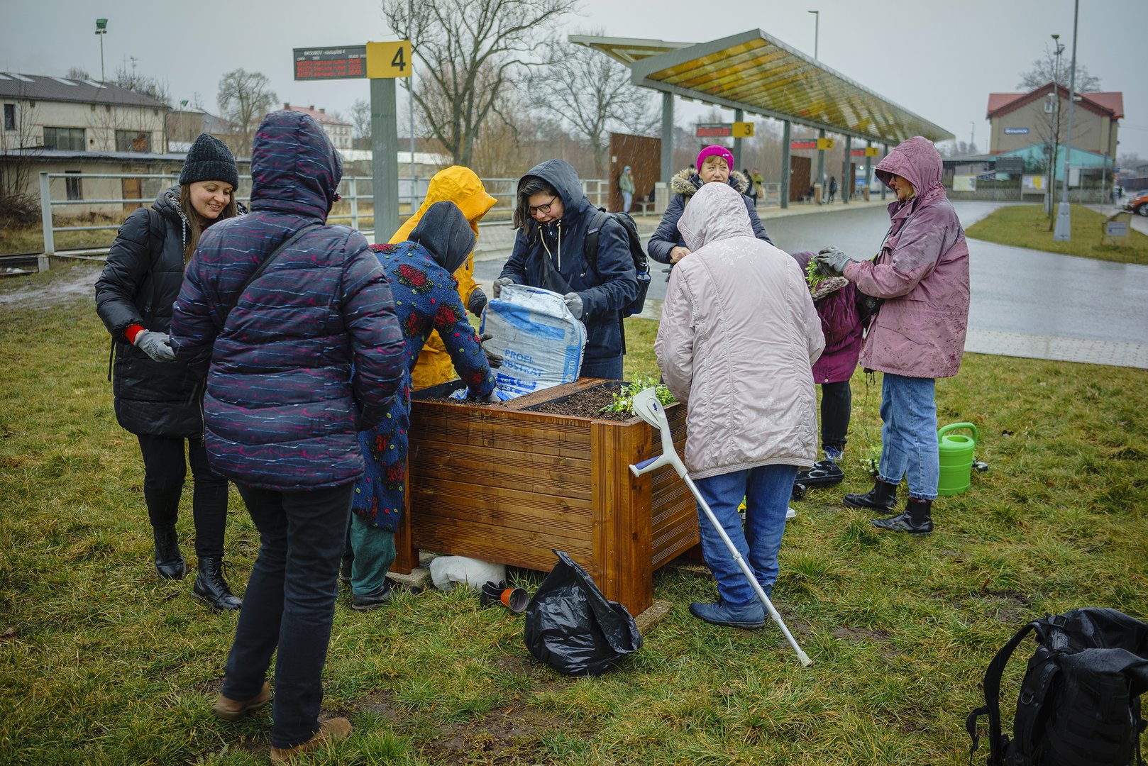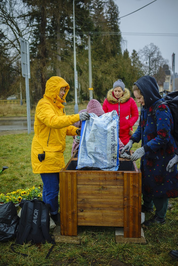 Společně jsme pak truhlík osázeli žlutými, bílými a fialovými maceškami a označili cedulemi, které budou připomínat začátek této nové tradice, jak pevně věříme. Mokrá hlína, ani sněhové vločky, střídající déšť, neodradily od veselého sázení seniorky, studentky a studenty gymnázia, děti, ale také Ukrajinky, které v Broumově našly se svými rodinami útočiště před válkou. Komunitní truhlík, o který se od této chvíle budeme společně, se tak stává živým zářivým bodem veřejného prostoru autobusového nádraží. To jindy působí poněkud neutěšeně a zejména po setmění se na něm některé ženy a dívky necítí bezpečně. Chtěli jsme proto Mezinárodní den žen věnovat péči o místa v našem městě, které ji potřebují. A postupně tak otevírat debatu, jak vytvářet přívětivější atmosféru na veřejných prostranstvích. Nádraží je pro mnohé návštěvníky Broumova vstupní branou do města, a i malá proměna, jako například komunitní truhlík, může vysílat jasný signál, že o svůj společný prostor pečujeme a není nám lhostejný.
