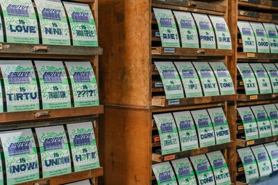 60 různých odpovědí jsme na závěr vystavili v tiskárně na regálech s písmy a všichni si tak mohli prohlédnout různé vize a věštby budoucnosti. Workshop měl velmi pozitivní ohlas a bylo skvělé vidět všechny ředitele muzeí a tiskáren doslova hrát si s plakátovými písmeny a tiskařským strojem. Shodli jsme se, že toto odpoledne příjemně oživilo jejich jinak spíše manažerskou a byrokratickou činnost a setřelo formální bariéry mezi jednotlivými účastníky.