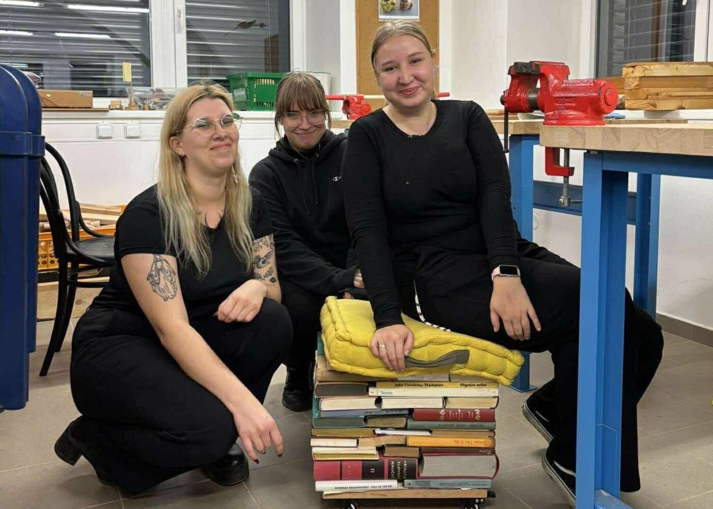 Součástí studijní návštěvy byla i účast na komunitní akci „Nábytek z příběhů“, kterou jsme organizovali ve spolupráci s DDM Ulita. Jednalo se o workshop práce se starými knihami – ty namísto ve sběrném dvoře posloužily k tvorbě taburetek, které se budou používat v nové knihovně.